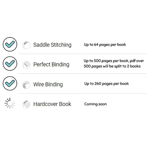 You might ask "What if the page count of my pdf document is over 64?", we recommend Wire Bound book as your choice.